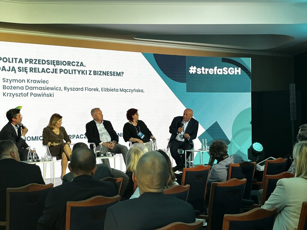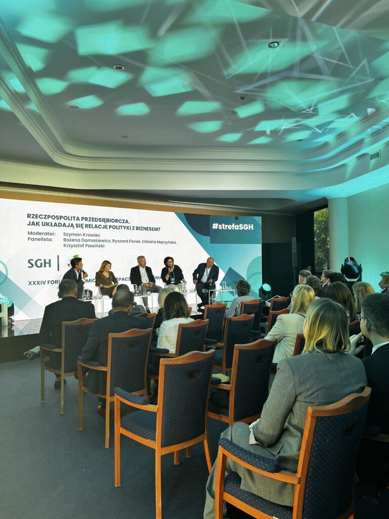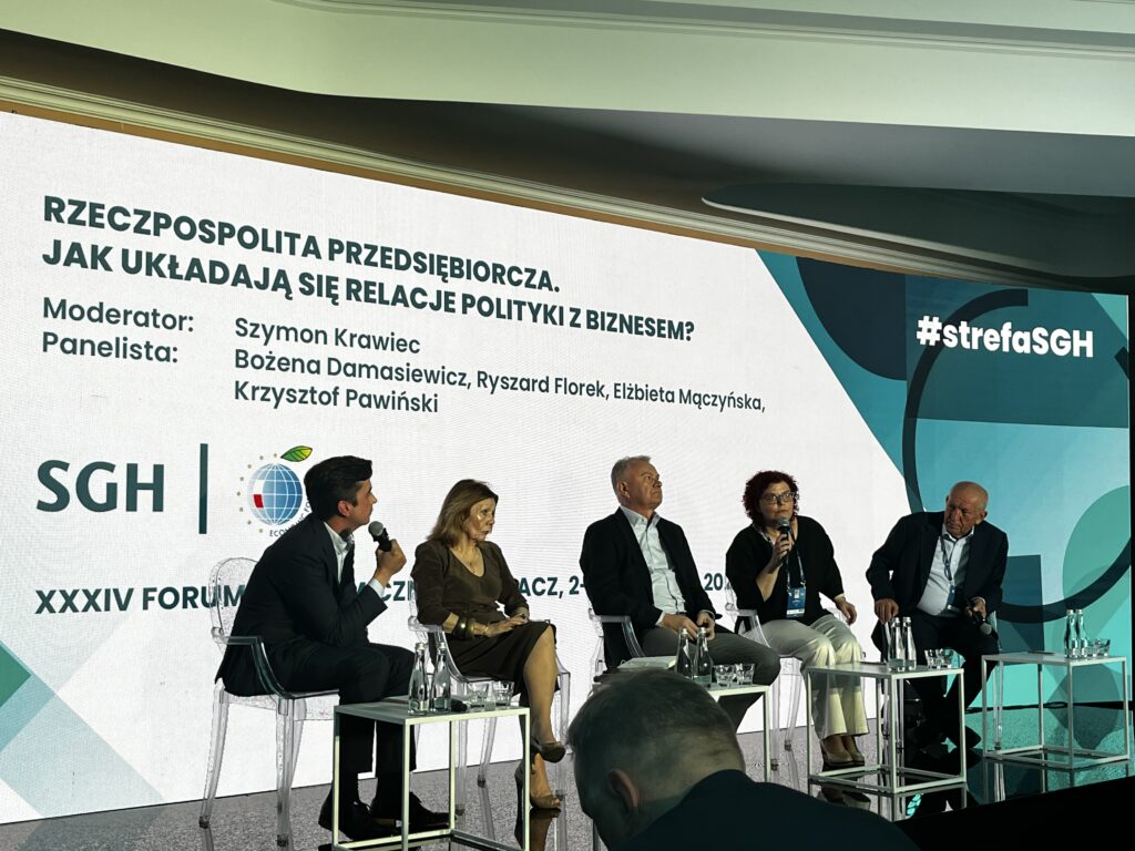 Już pierwszego dnia Forum zaprezentowano raport „Polityka kontra Biznes”, opracowany wspólnie przez Fundację Pomyśl o Przyszłości, tygodnik WPROST, Radę Polskich Przedsiębiorców Globalnych i SGH Warsaw School of Economics. Wyniki badań jasno pokazały, że większość Polaków ocenia relacje między państwem a przedsiębiorcami jako słabe, co stanowi istotne wyzwanie dla rozwoju gospodarki opartej na partnerstwie i wzajemnym zaufaniu. Dyskusja wokół raportu, w której udział wzięli m.in. Ryszard Florek, Bożena Damasiewicz, Krzysztof Pawiński, prof. Elżbieta Mączyńska i Szymon Krawiec, skupiła się na tym, jak tworzyć stabilne otoczenie regulacyjne i wspierać przedsiębiorców w budowaniu silnych, konkurencyjnych firm.